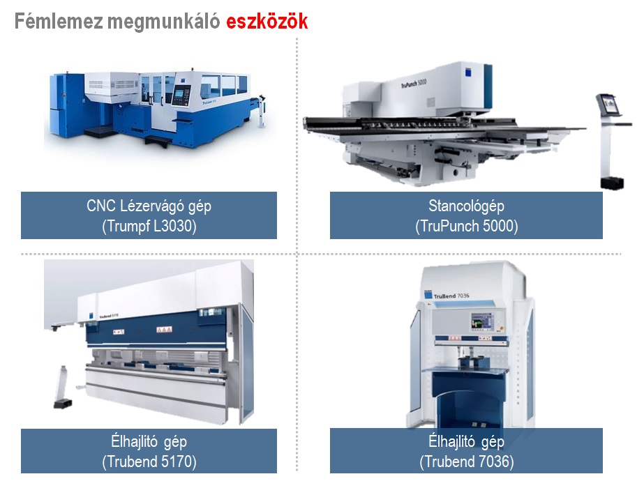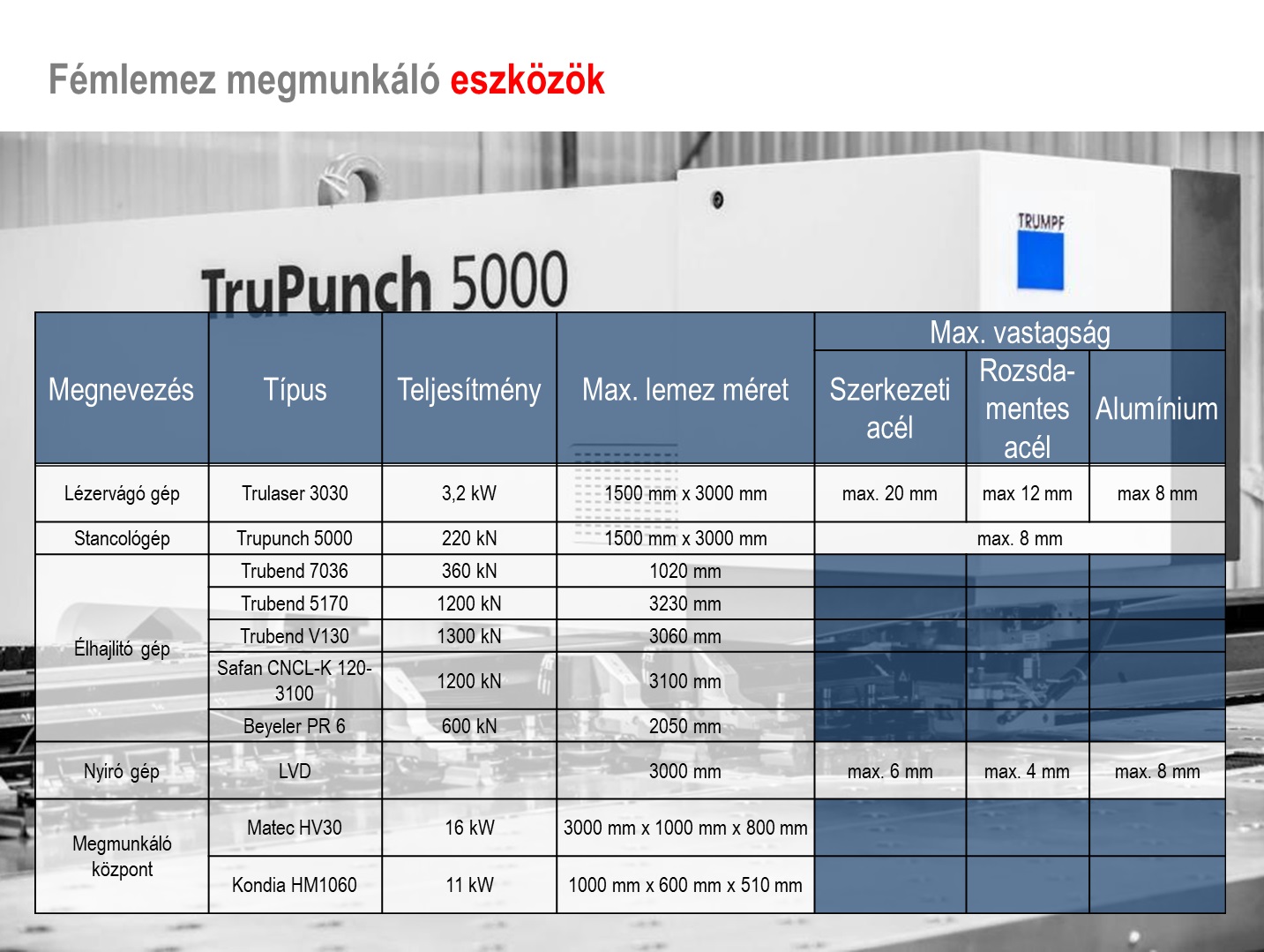 CNC vezérlésű gépeink alumínium, acél és rozsdamentes anyagok nagy pontosságú megmunkálására, lézerrel történő kivágására, stancolására 3 méteres lemezhosszban és 1–20 mm anyagvastagságban.